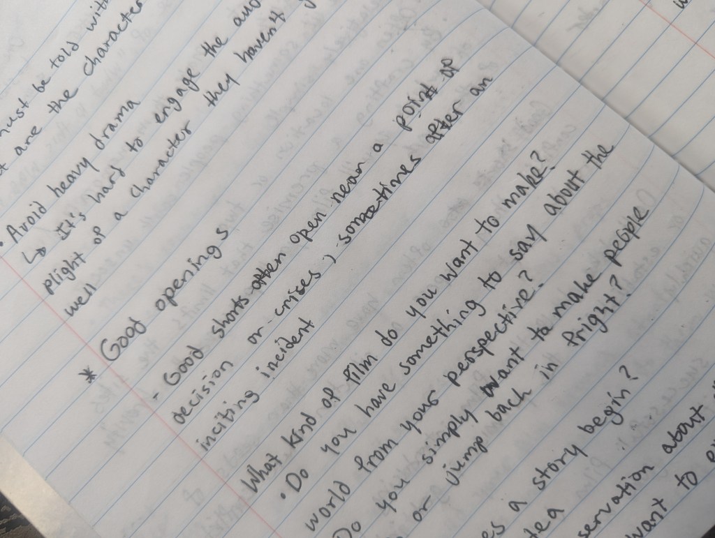 There’s a lot to unpack from all the Field says above. First, I want to note that any italics, bolding, or capitalization from up there was Field’s, and I thought it important to retain that form because it does a lot to get his message across. It sort of shows me that while it’s important to be feeling something during your writing process, to be inspired, to deliver something that has impact, none of that is negated by the need to do a little planning before you start. I think that’s where I got caught up. I had the notion that you couldn’t be one of the greats / have a wild story unless you flew by the seat of your pants, but after reading this I’ve come to the realization that this kind of planning is something a lot of the greats do, no matter to what degree. Seeing some movies it’s hard to believe that any of it could’ve been thought out beforehand, but I’d bet a lot of those writers had at least those above questions answered before they started writing. It’s not necessarily a crime if you write your first draft with absolutely none of this in mind and then come back to it, analyzing it through this lens; I’m sure a lot of great writers do that too, although it may not prove as freeing when you’re on a deadline (I hope to eventually have that problem). I just think it’s probably best to get into this practice sooner rather than later so you at least have it in your back pocket.